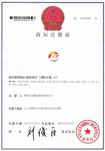 朝陽市金麟鐵精粉有限公司“企業(yè)徽標”商標注冊成功,是公司品牌建設的重要里程碑,這標志著我公司開始走上品牌發(fā)展之路,真正建立起了走向市場的“名片”,也是公司信譽和質(zhì)量的象征,將促進我們不斷提升服務水平和商品質(zhì)量,公司一直以“開拓創(chuàng)新,精益求精,精細管理,優(yōu)質(zhì)服務”的質(zhì)量方針,為創(chuàng)造強勢品牌和公司可持續(xù)發(fā)展奠定堅實基礎。